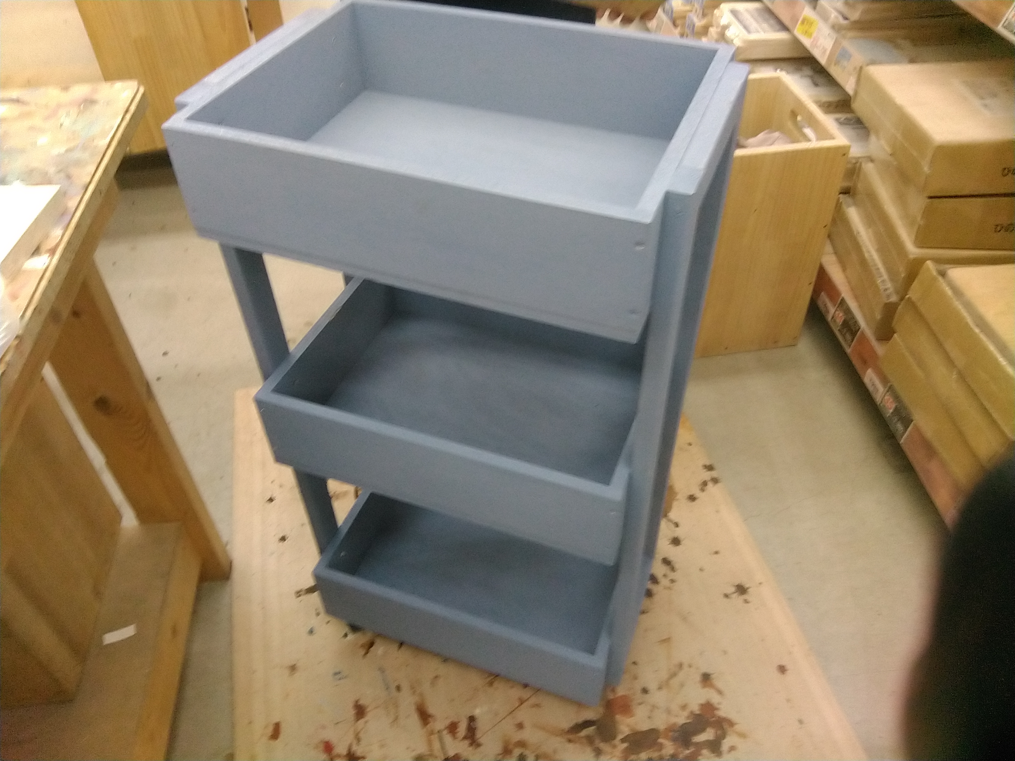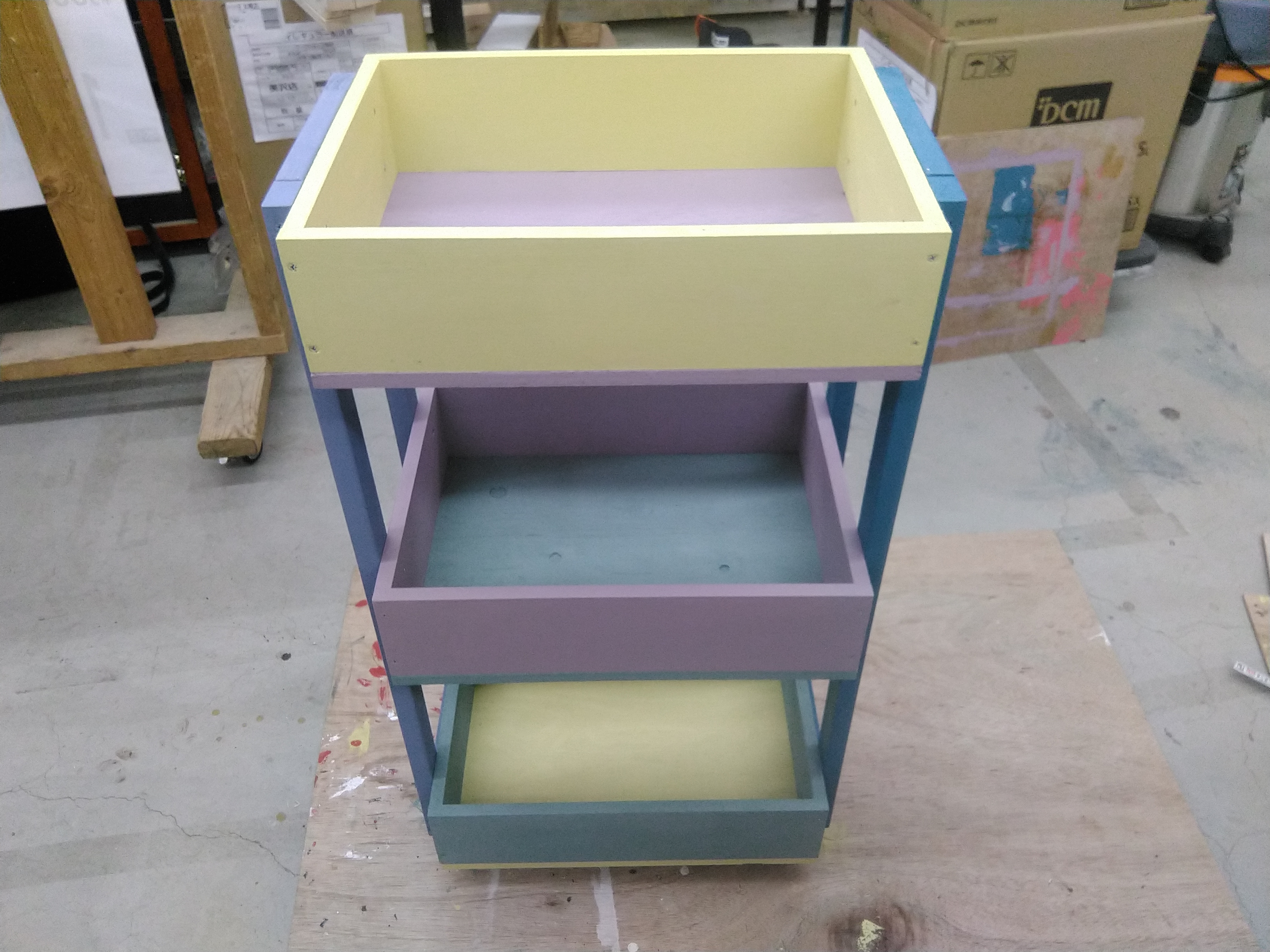 カット済み木材を電動工具で組み立て、ワックスや水性塗料でペイントします。重ねる位置によって幅を調整して使えます。ねじ打ちの本数や工程が少なく、初めてのDIYにもぴったりです。