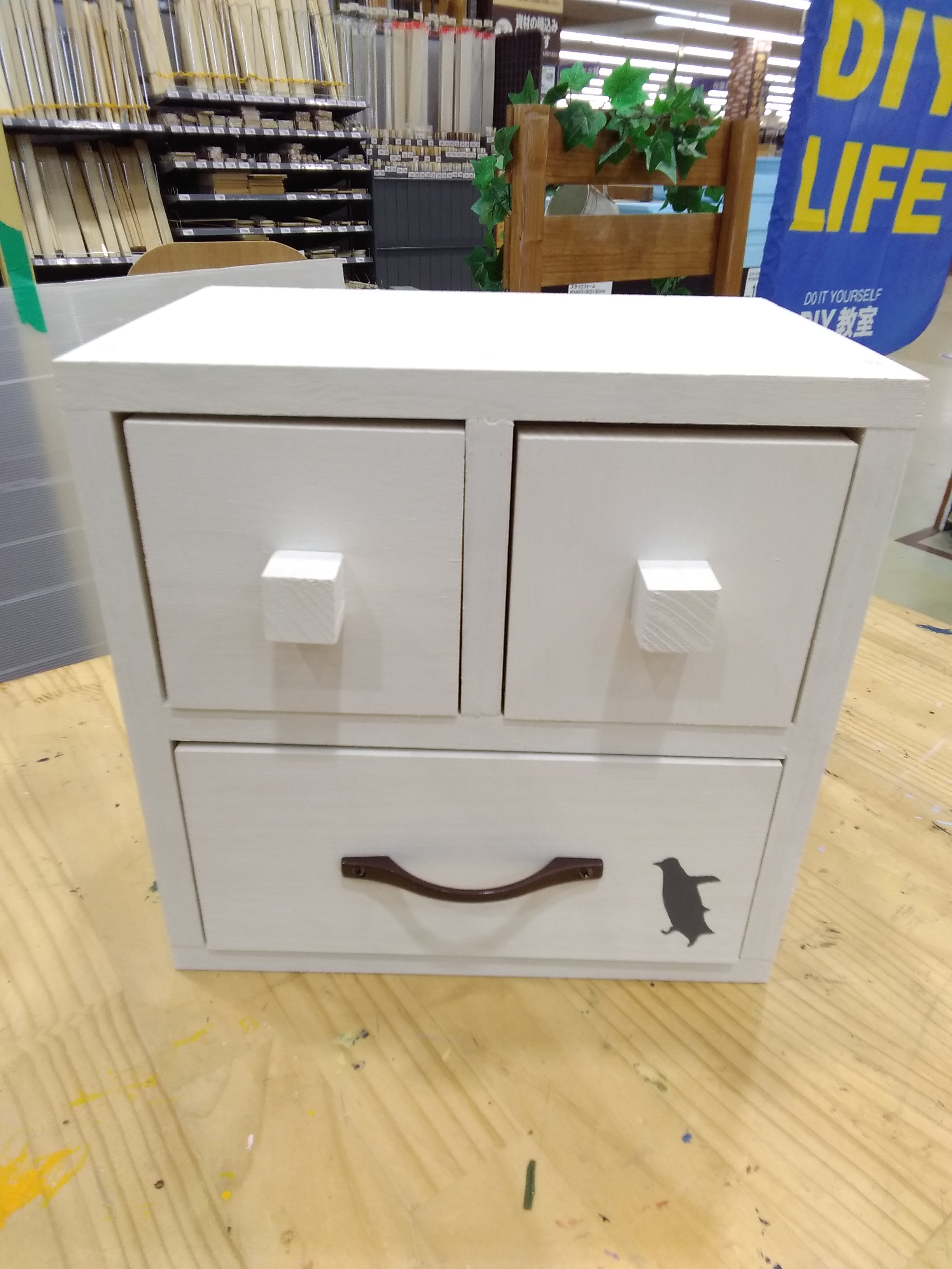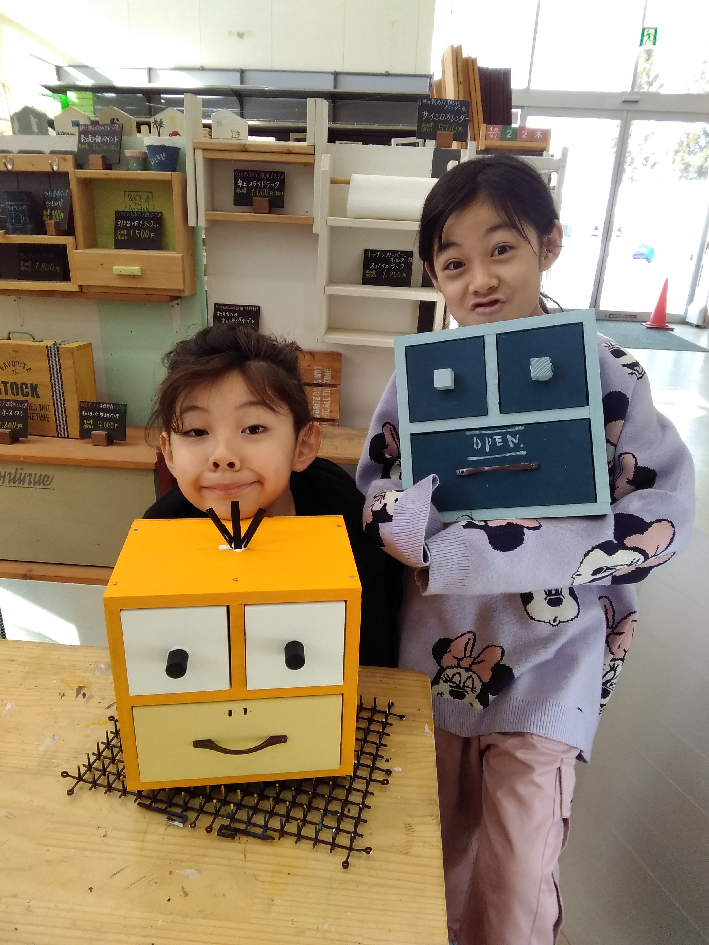 【10~12時、14~16時まで随時受付、当日先着順、正面玄関入口付近で開催】予めカット塗装済みの木材を、デコパージュまたは丸棒を貼り付けてデコレーションします。
