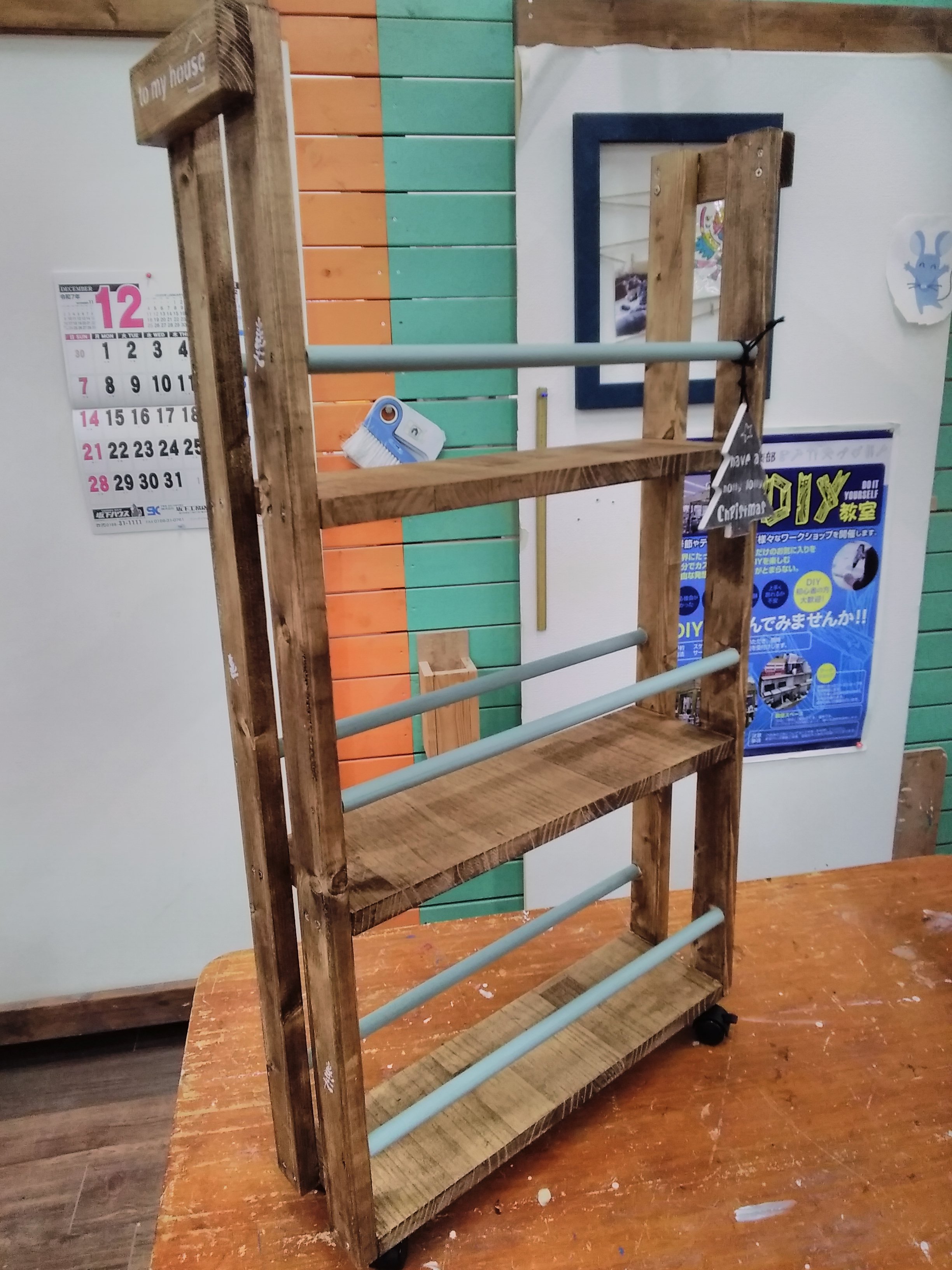 【午前1回の開催です】カット済みの木材を電動工具で組み立て、水性塗料でペイントします。カフェ風の屋根がポイントです。リビングやキッチン、お子さまのおままごとにもピッタリの棚を一緒に作りましょう。