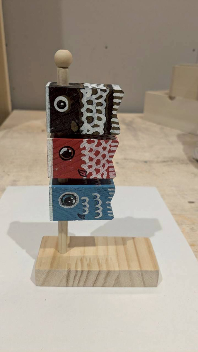 こいのぼりの形にカットされた木にお顔や模様を描いていきます。ちょっとしたスペースにも飾れる、木のぬくもりあふれるこいのぼり作りませんか?【対象年齢:4歳~】