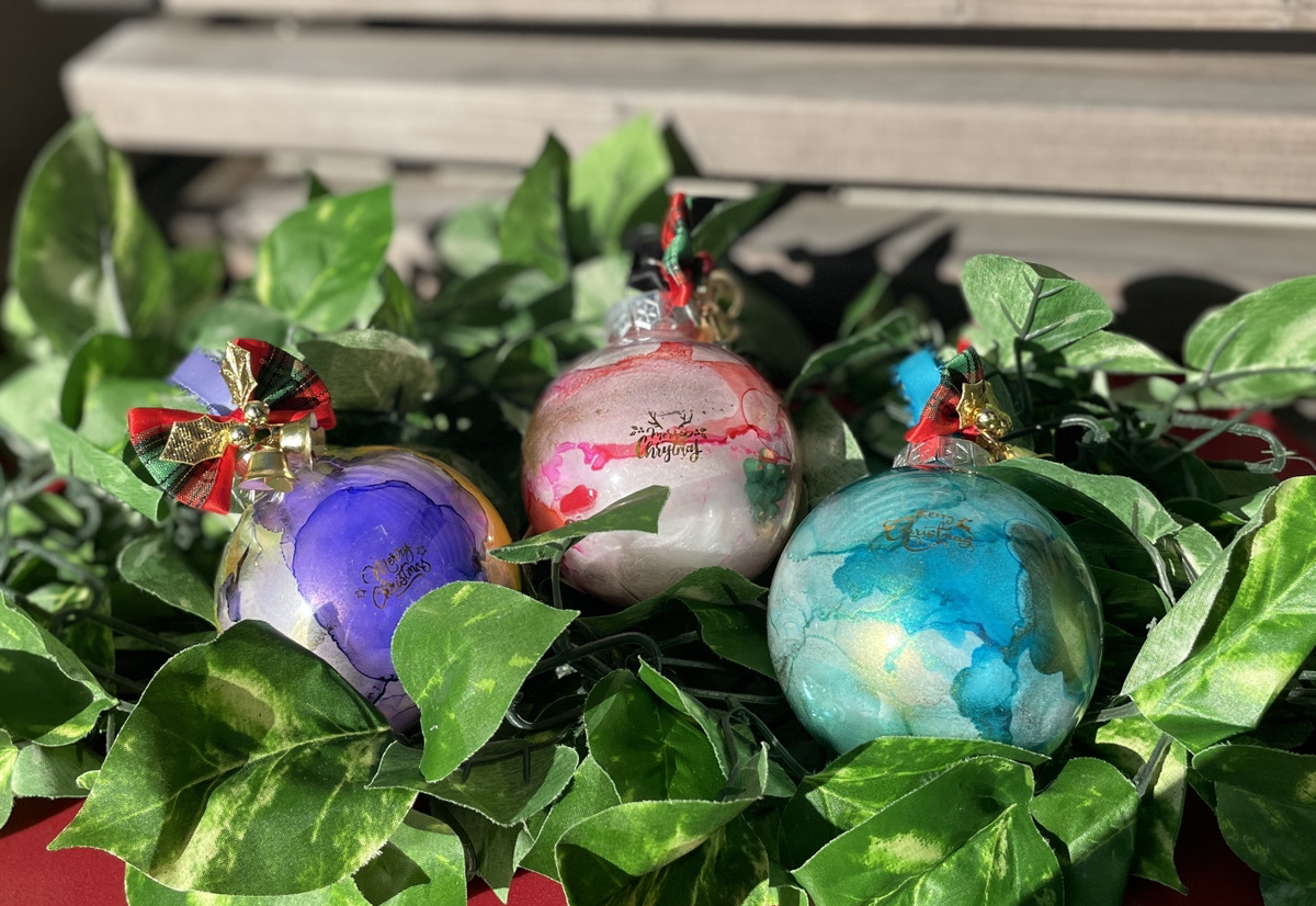 アルコールインクアート第3弾♡今回はクリスマスに使用できるオーナメントを2個作成。プラスチックでできた球体の入れ物にアルコールインクアートを入れて転がして模様を付けるよ。中に入れるビーズやリボンを選べるよ。