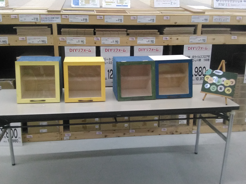 カット済の木材を電動工具で組み立て、水性塗料やワックスで塗装します。中に棚があるのでコップの収納などキッチン周りの収納に大活躍♪キッチンやリビングテーブルの上などちょっとした空間のインテリアにも可愛い作品です。