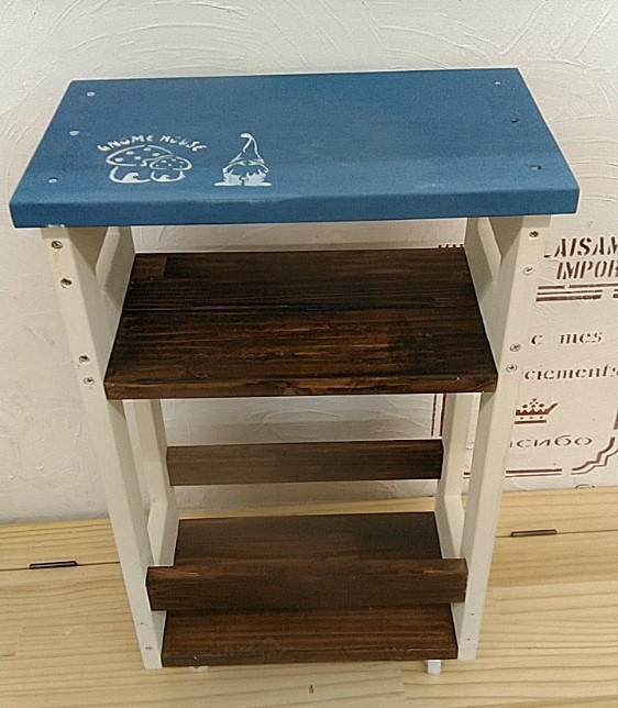 カット済みの木材を電動工具で組立て、水性塗料やワックスでペイントします。横から見ると「S」字に見えるシェルフです。小さな鉢や小物のディスプレイにおすすめです。