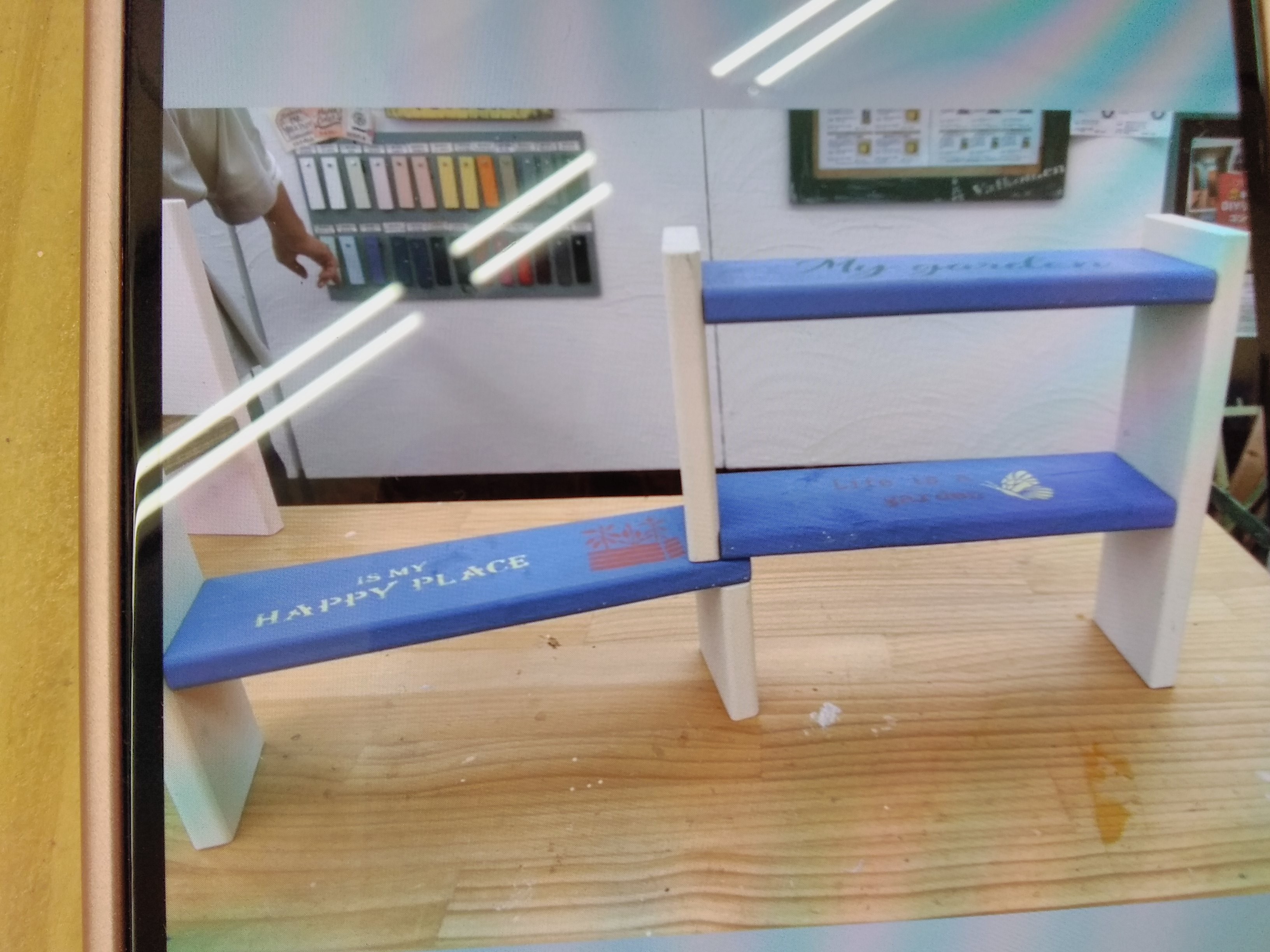 【午後1回の開催です】カット済みの木材を電動工具で組み立て、水性塗料などで塗装します。小物置きや鉢台など、飾り棚として使える小型のベンチです。鉢花だけでなく、多肉植物や観葉植物など使い方は様々!お庭のアクセントにいかがですか?