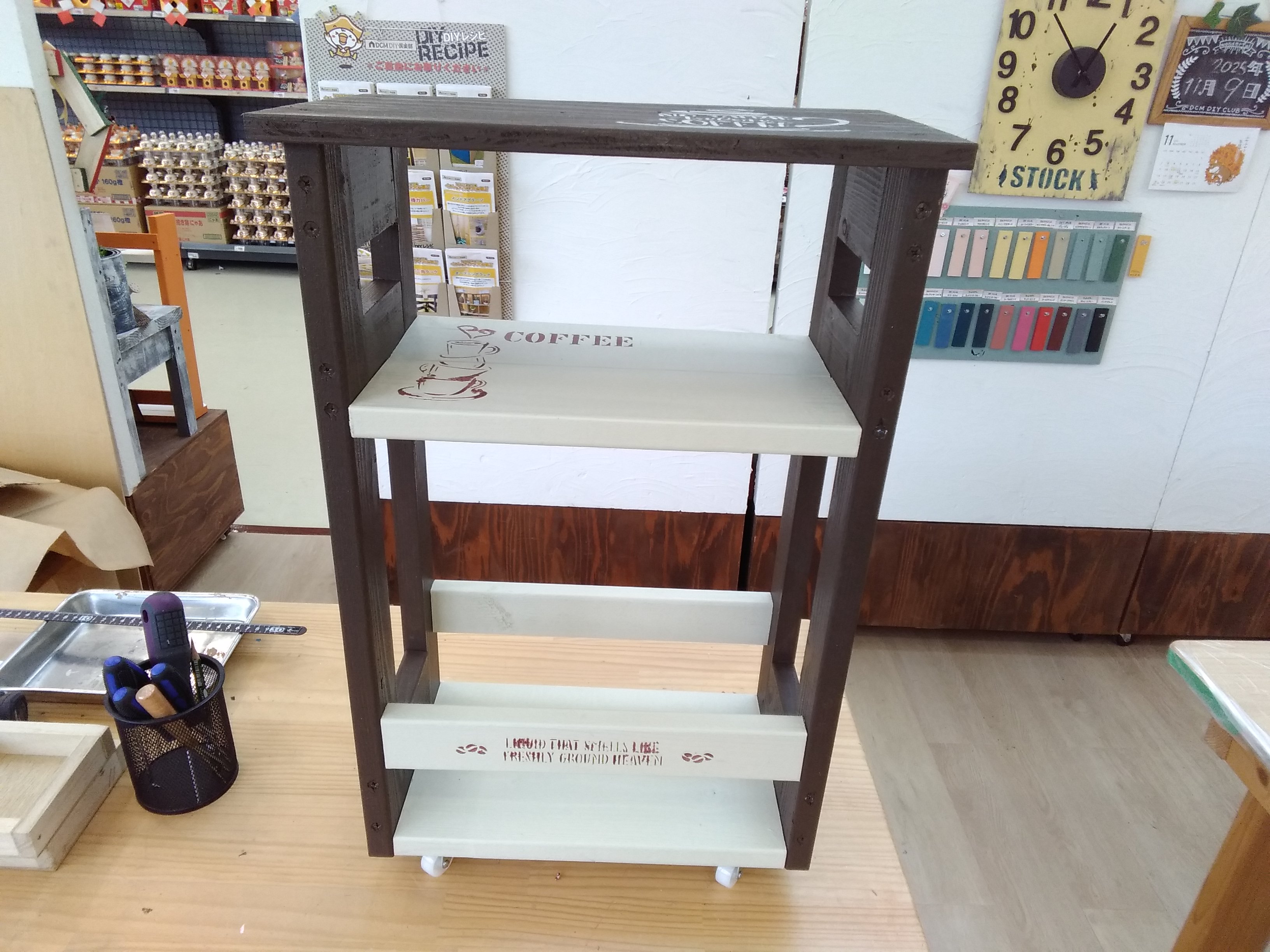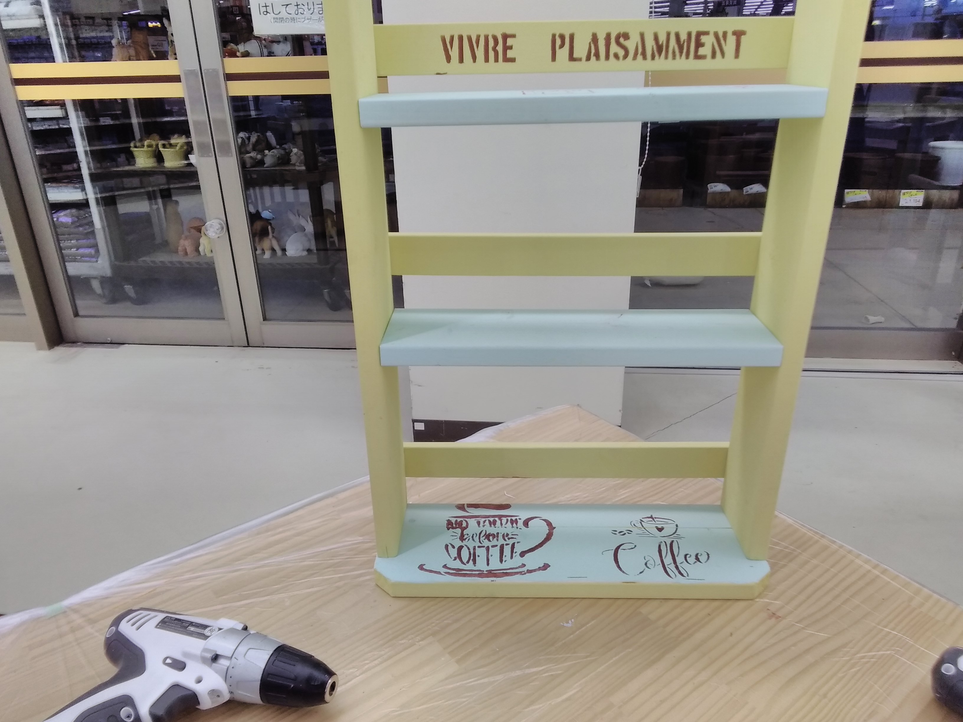 【午前1回の開催です】カット済みの木材を電動工具で組み立て、ワックスと水性塗料でペイントし、ステンシルで仕上げます。防災用品や園芸用品など収納力抜群!玄関先で荷物を置いたり、軽く腰掛けたり、収納もできる実用性の高い作品です。ちょっとしたコツが必要な”蝶番”の取り付け方も学べます。