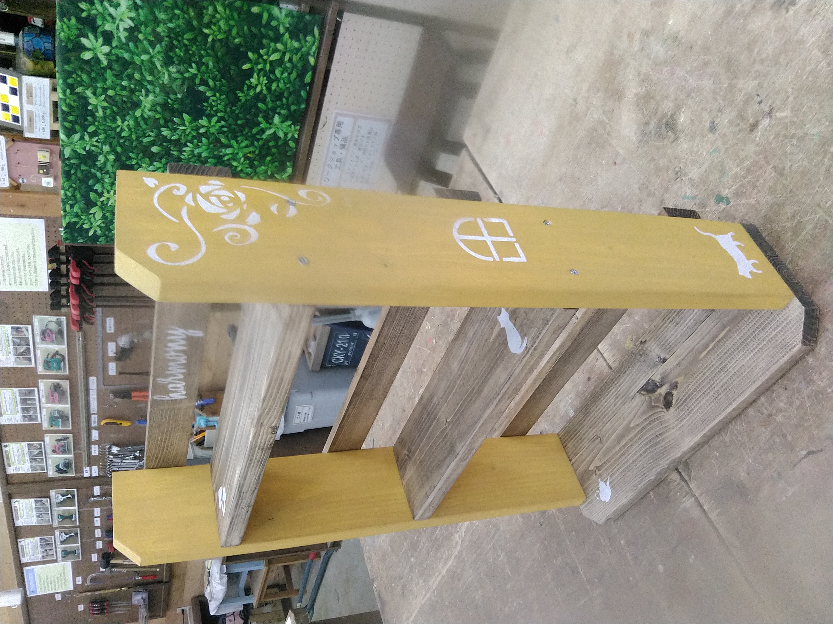 カット済みの木材を電動工具で組み立て、ワックスと水性塗料でペイントします。肉球型にくり抜いた引き出しがポイントです。またお子さん、お孫さんのおままごとや、ワンちゃんやネコちゃんのクローゼットとして背板にペットの名前をステンシルできます。
