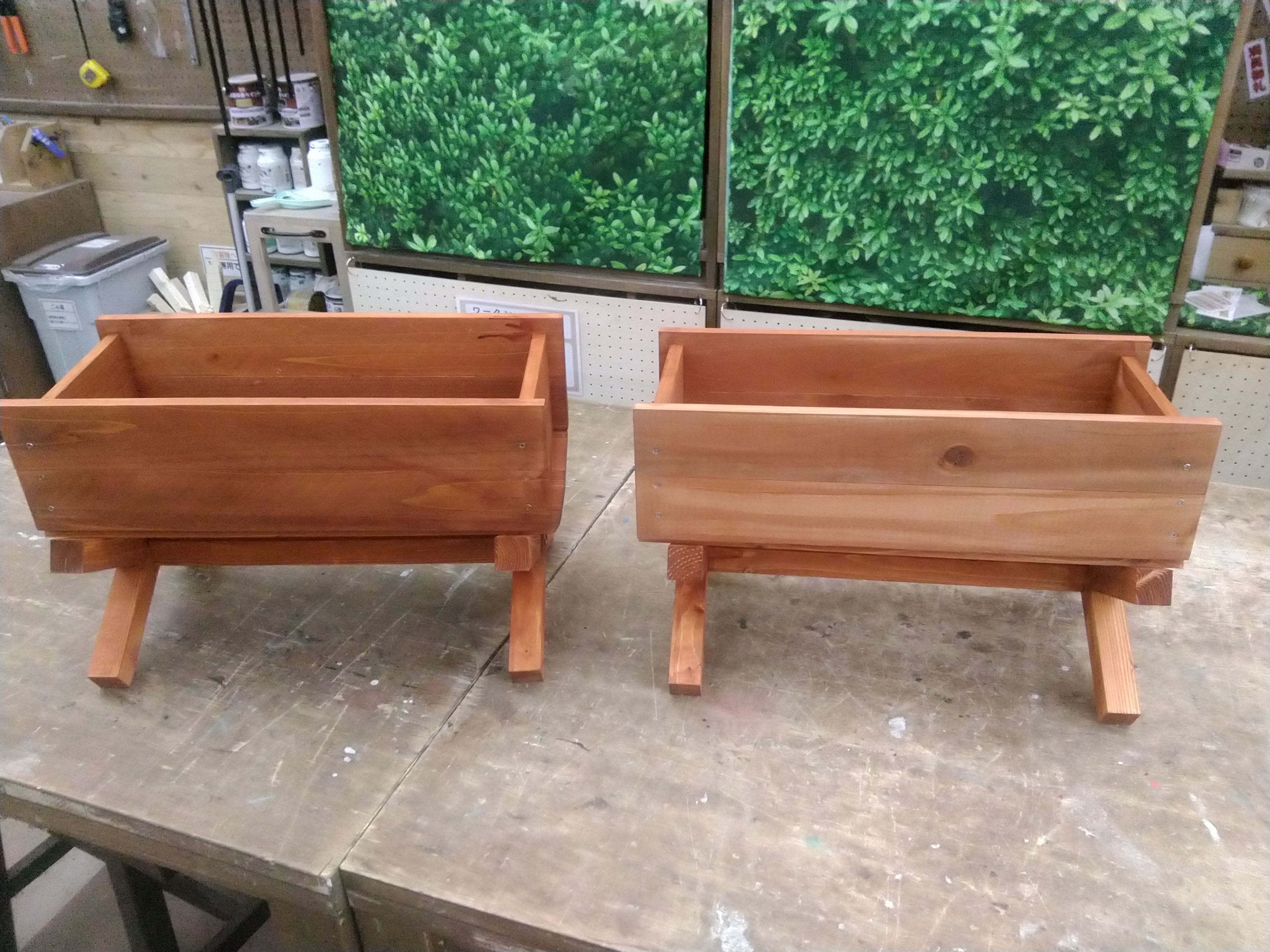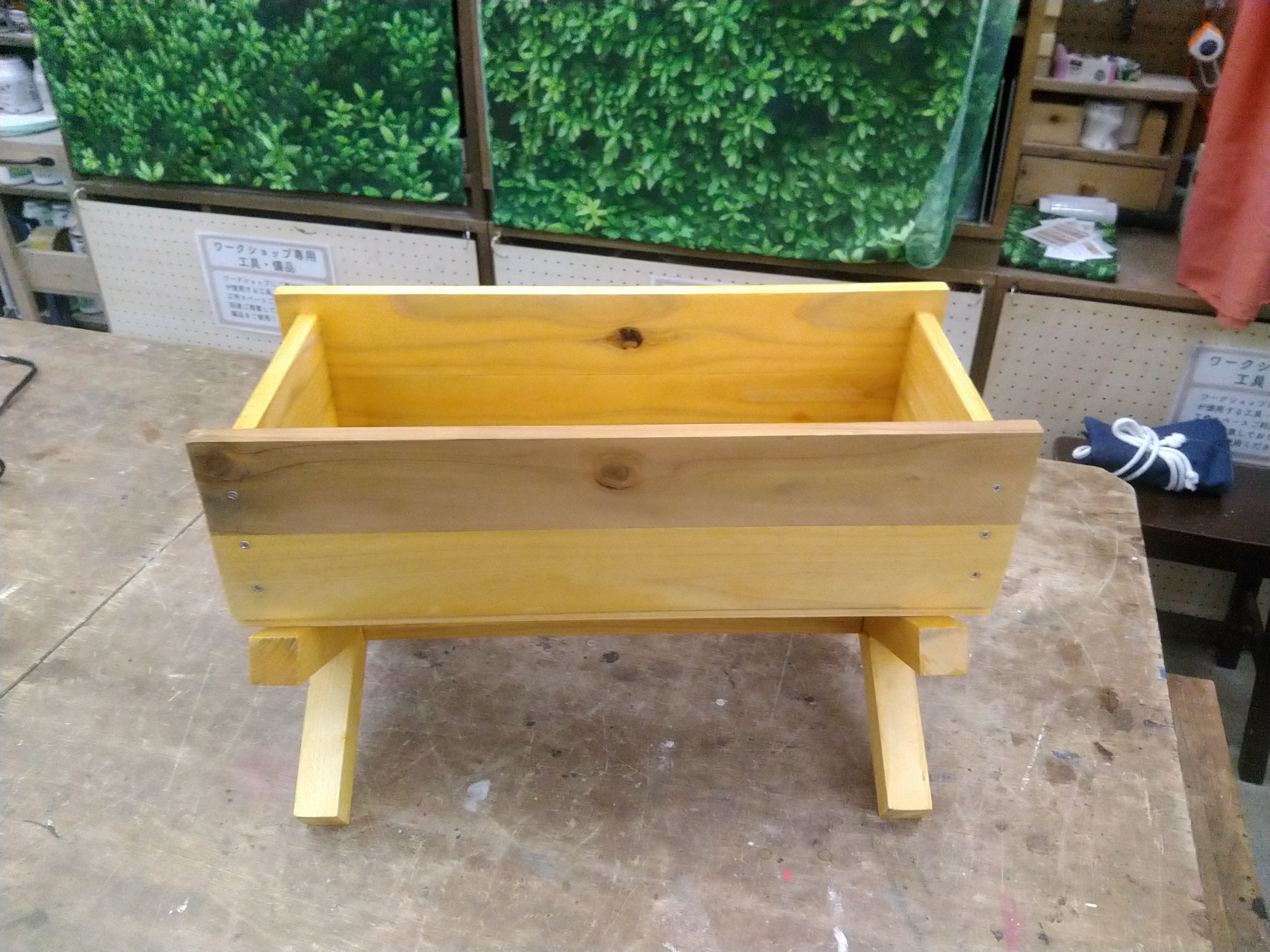 【午後1回の開催です】作業時間120分の初心者から中級者向けのメニューです。カット済みの木材を電動工具で組み立て、水性塗料でペイントします。草花を立体的な絵画のように縁取って楽しめるプランターです。(※参加費に植物は含まれません)