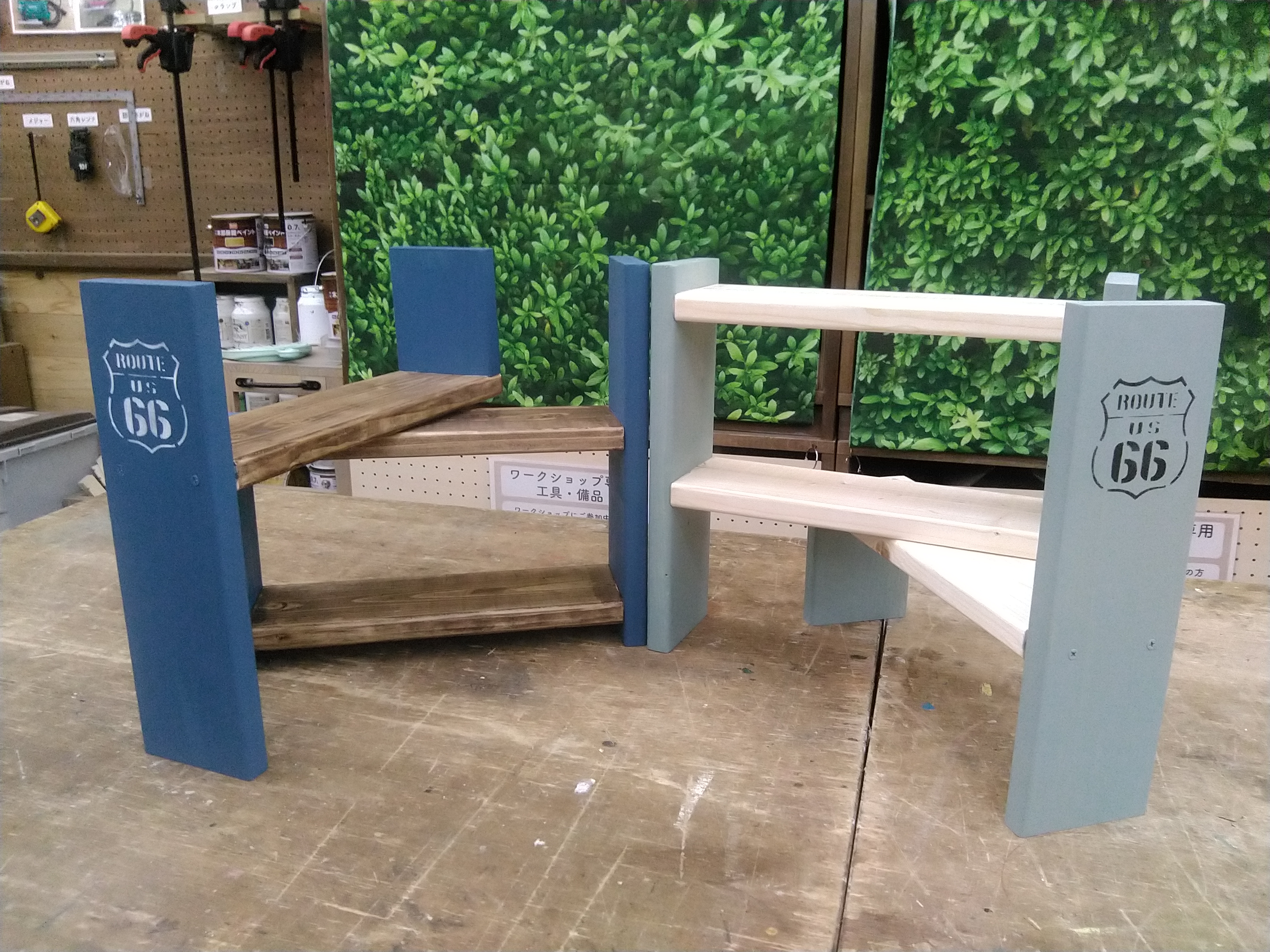 カット済みの木材を電動工具で組み立て、オールドウッドワックスなどでペイントします。絵本やお気に入りの雑誌を見せながら収納できる人気の作品です!電動ドリルだけでなく、電動サンダーやクランプの使い方もマスターしましょう!