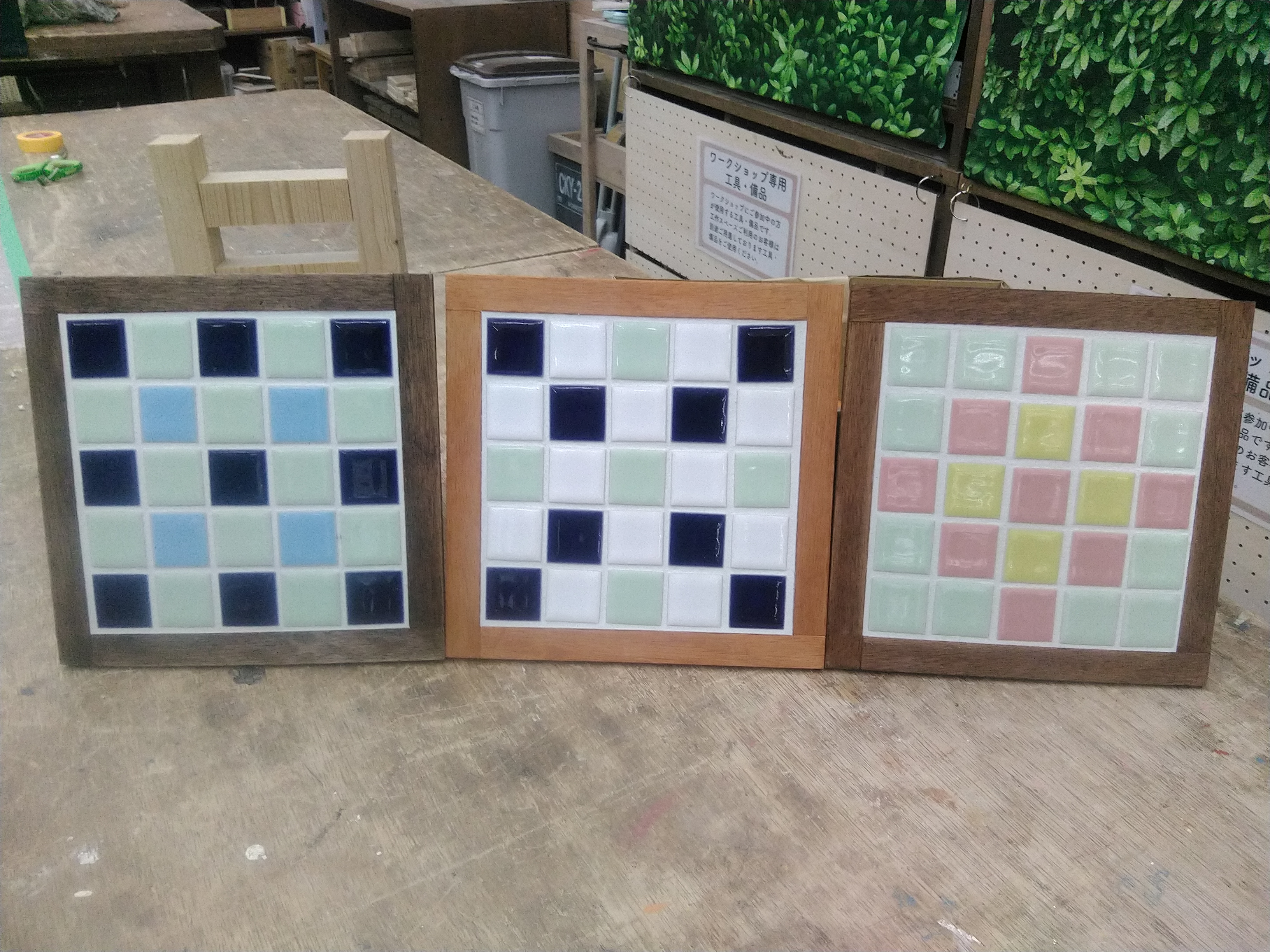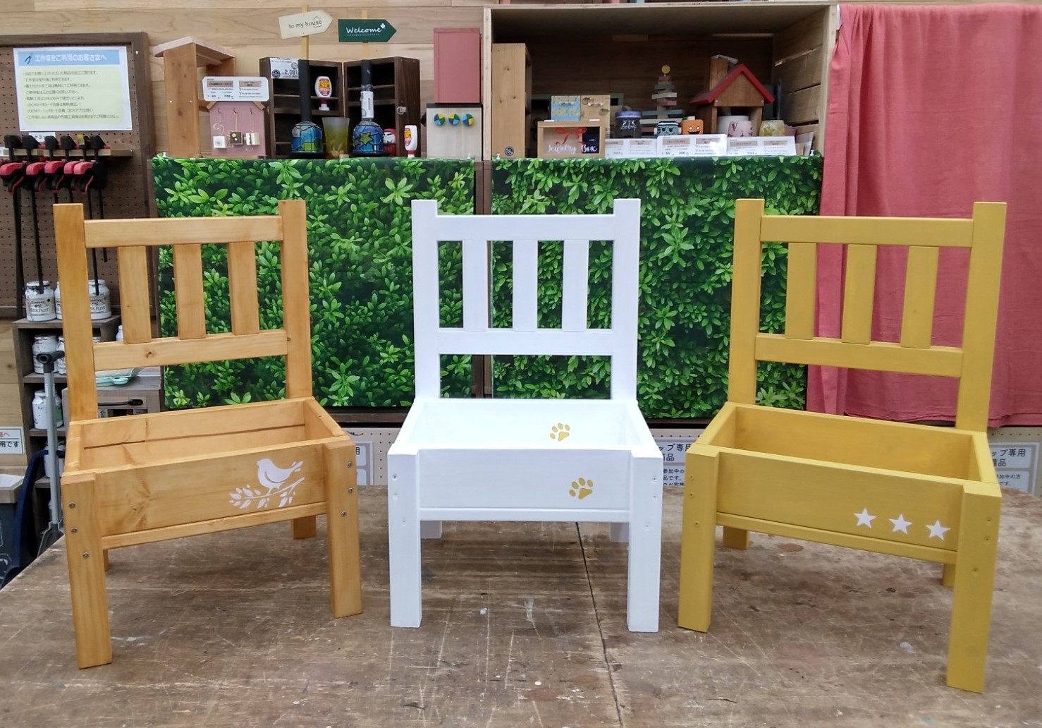 カット済みの木材を電動工具で組み立て、水性塗料やワックスなどでペイントします。小さめの観葉植物や多肉植物のディスプレイにおすすめの作品です。それぞれのボックスは取り外して持ち運べるので、お手入れや入れ替えも便利です。