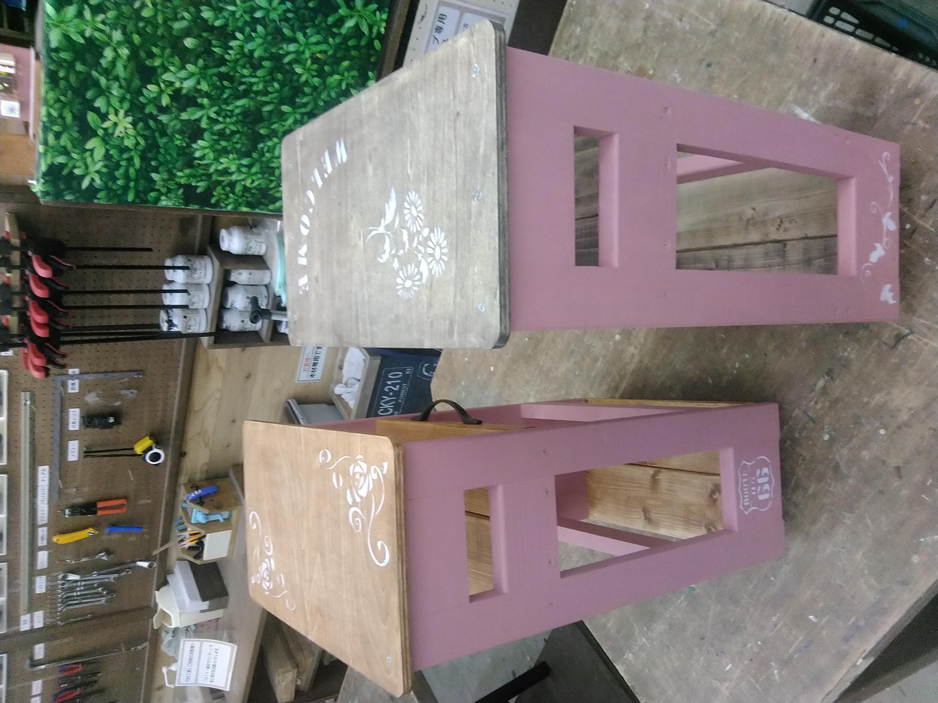 【午後1回の開催です】カット済みの木材を電動工具で組み立て、ワックスでペイントします。懐かしのイスは横にして作業台として使う他、花台やサイドテーブルとしても活躍する注目の作品です。