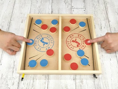 カット済みの木材を組み立て、パックをペイントしたり、盤面をステンシルで装飾します。スリングホッケーは、パックをゴムで弾いて相手の陣地に送り込む、大人も子どもも楽しめるボードゲームです。作るワクワクと遊ぶ楽しさ、両方を体験しましょう。