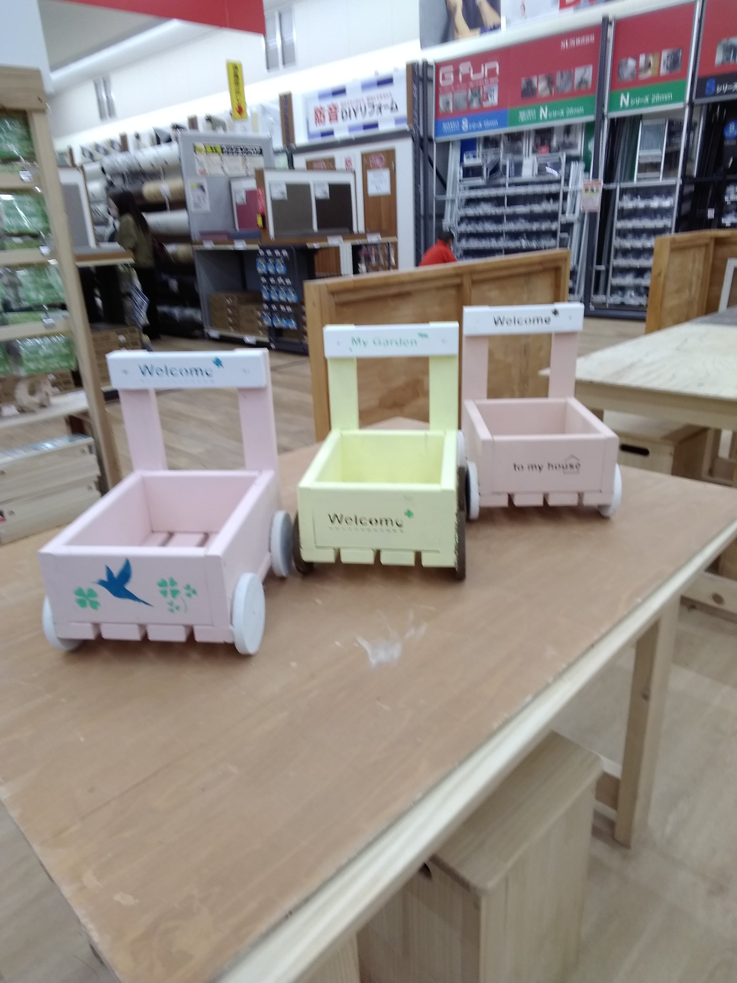 カット済みの木材を電動工具で組み立てます。水性塗料でペイントし、ステンシルで仕上げましょう。お花用のプランターとしてだけでなく、お子様のおもちゃ箱としても使えます。カート型でかわいいので子供部屋にもピッタリです!