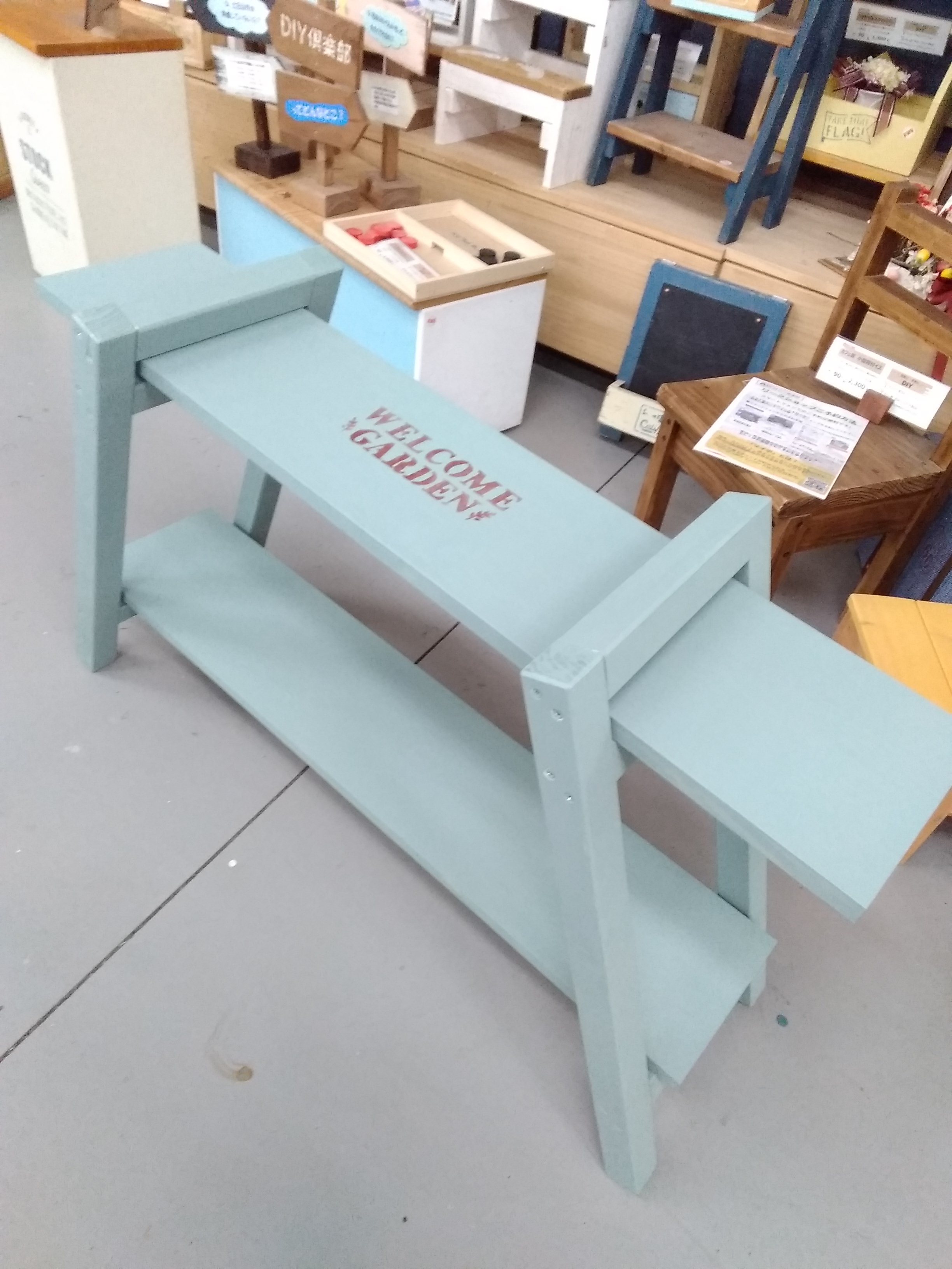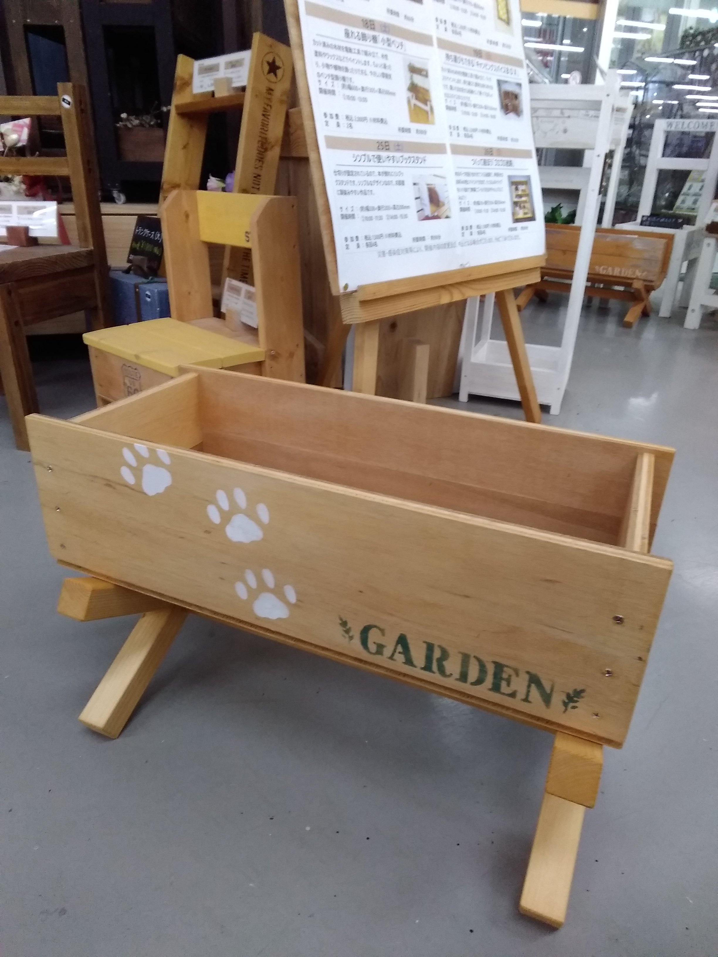 カット済みの木材を電動工具で組み立て、木材を長持ちさせる屋外用水性塗料でペイントします。イスの座面部分はたっぷり花苗を寄せ植えできるサイズなので、お庭の主役になる作品です。鉢花だけでなく、多肉植物や観葉植物など活用方法は様々!色の組み合わせで表情も変わりますので、ご自宅のお庭の雰囲気に合わせてみてはいかがでしょうか。