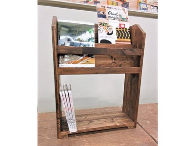 【午前1回の開催です】カット済みの木材を電動工具で組み立て、オールドウッドワックスなどでペイントします。絵本やお気に入りの雑誌を見せながら収納できる人気の作品です。電動ドリルだけでなく、電動サンダーやクランプの使い方もマスターしましょう!