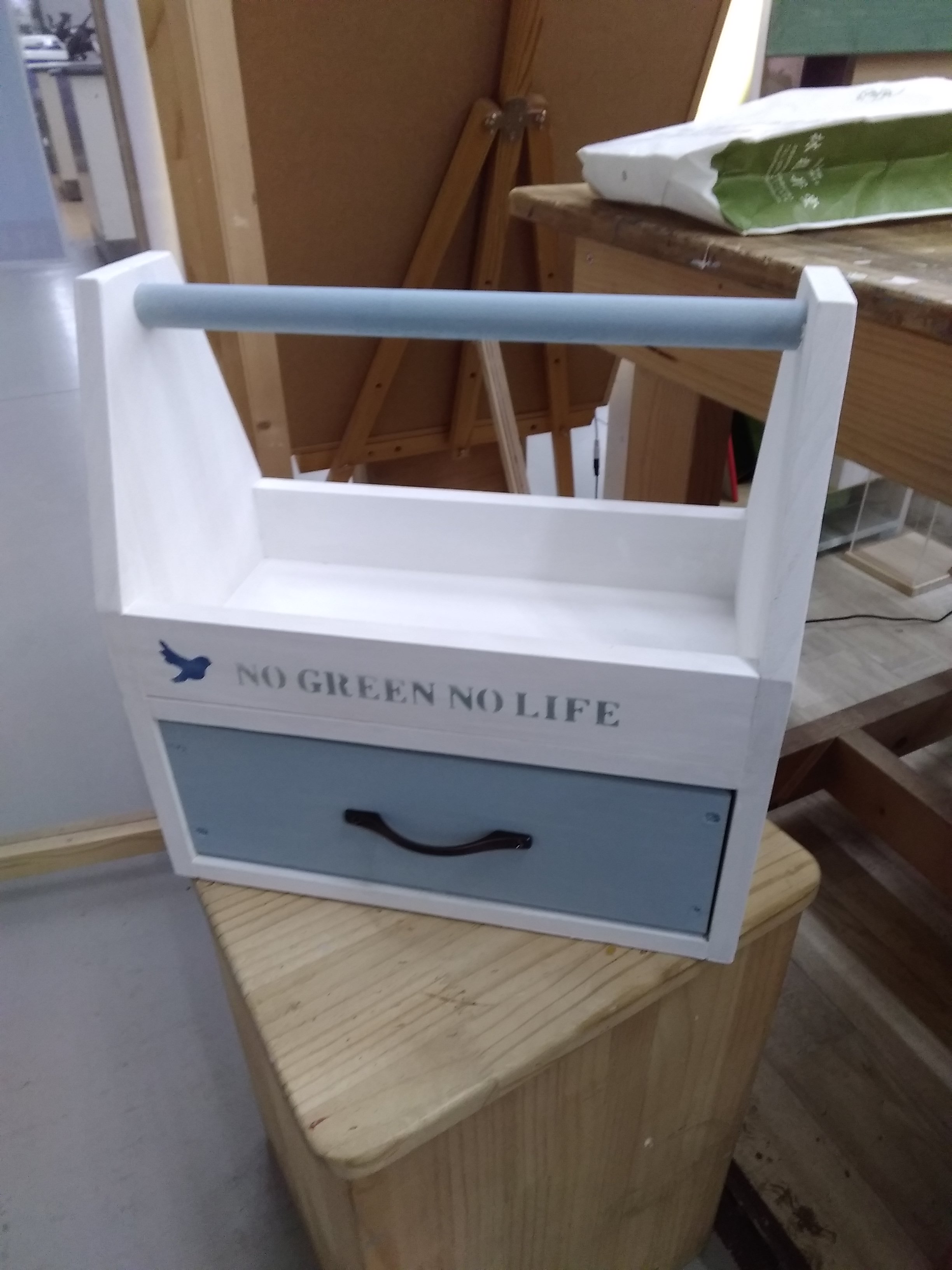 【午前1回の開催です】カット済みの木材を電動工具で組み立て、ワックスや水性塗料でペイントします。シンプルなデザインなので、小物を飾ったりお部屋の整頓にオススメです。ダボ加工でビスの頭を隠す方法も学べます。