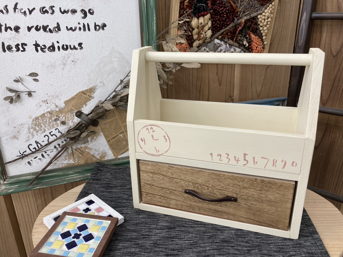 カット済みの木材を電動工具で組み立て、水性塗料でペイントします。お気に入りの小物や文房具、アクセサリー入れにおすすめの作品です。お気に入りの小物や文房具、アクセサリー入れにおすすめの作品です。